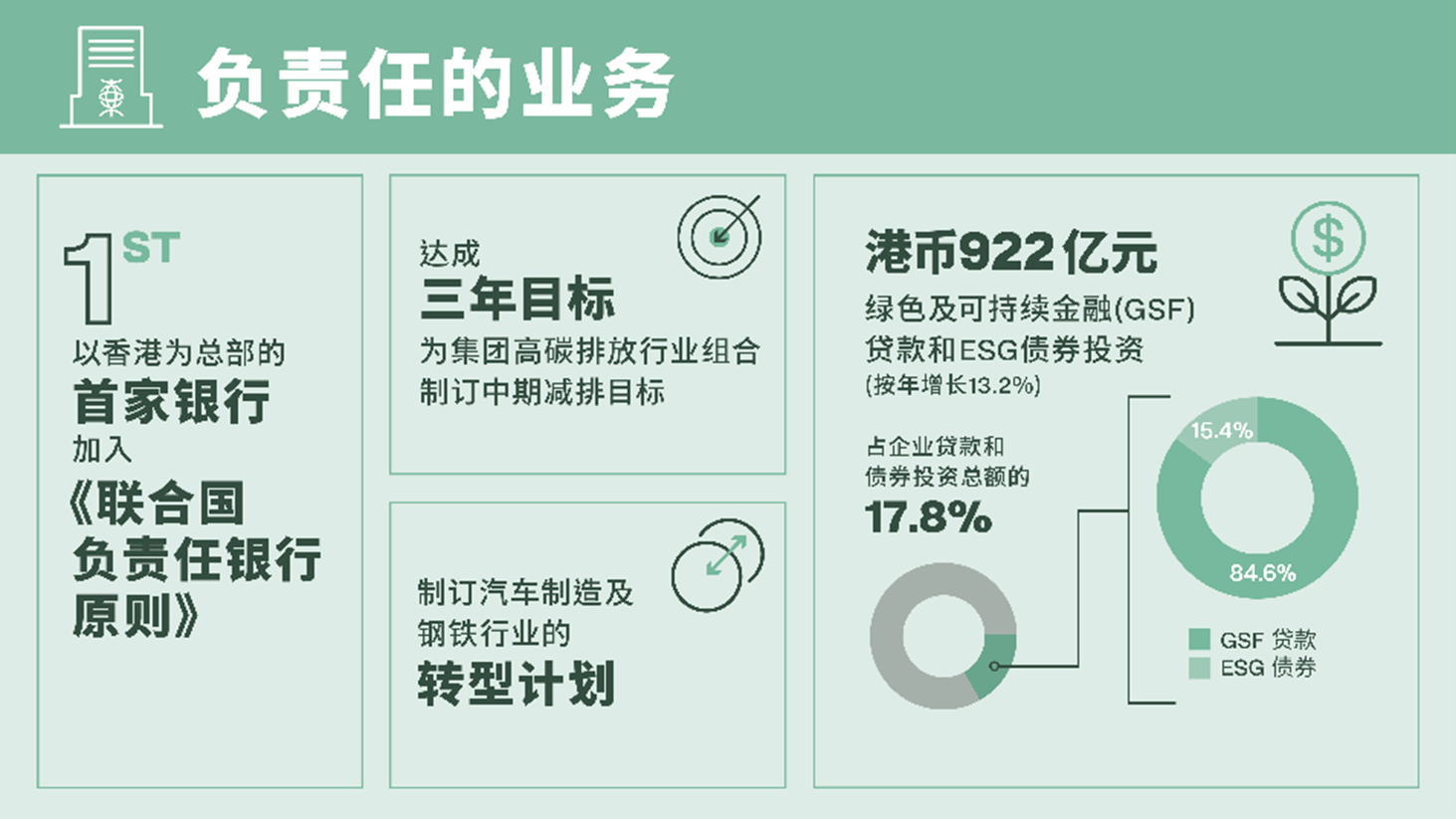 · GSF貸款和ESG債券投資總額達(dá)港幣922億元(按年增長(zhǎng)13.2%)