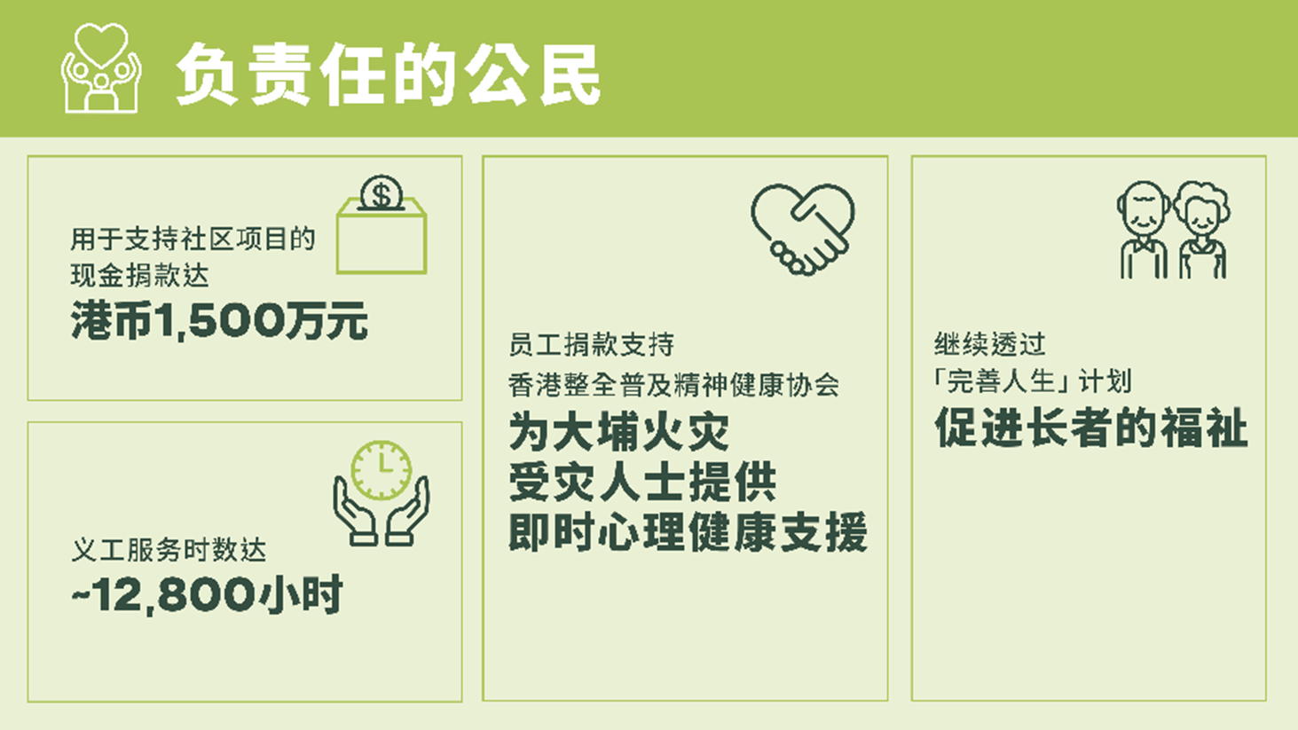 因應(yīng)大埔宏福苑火災(zāi)事件,本行向香港特區(qū)政府的援助基金捐贈(zèng)港幣1,000萬元,并設(shè)立“東亞銀行社區(qū)同行基金”鼓勵(lì)集團(tuán)同事捐款支持,透過香港整全普及精神健康協(xié)會(huì)為有需要的居民免費(fèi)提供專業(yè)心理及精神治療服務(wù)。中國(guó)內(nèi)地同事亦透過中國(guó)社會(huì)福利基金會(huì),向香港五間社福機(jī)構(gòu)捐款。