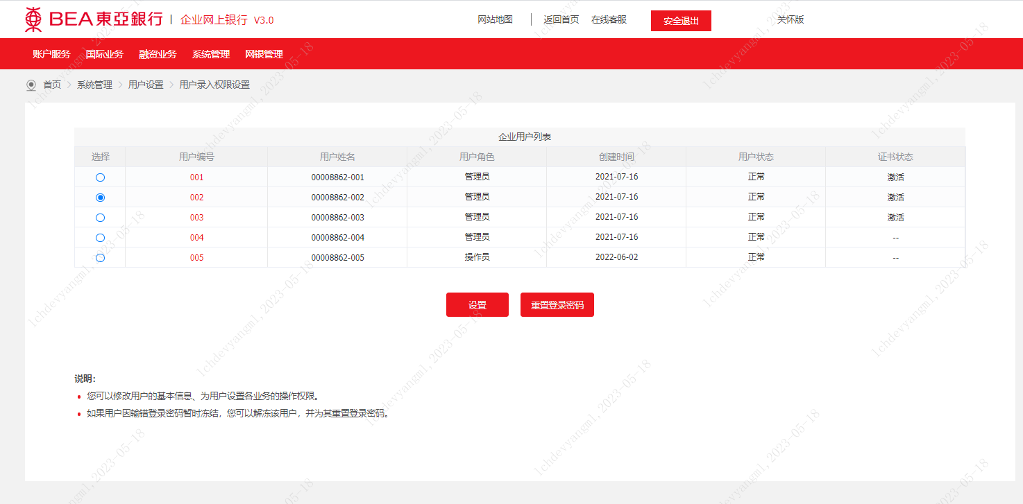 1.1.1. 管理員登錄企業(yè)網上銀行,進入“系統(tǒng)管理”→“用戶設置”,為企業(yè)的各個用戶設置操作權限。