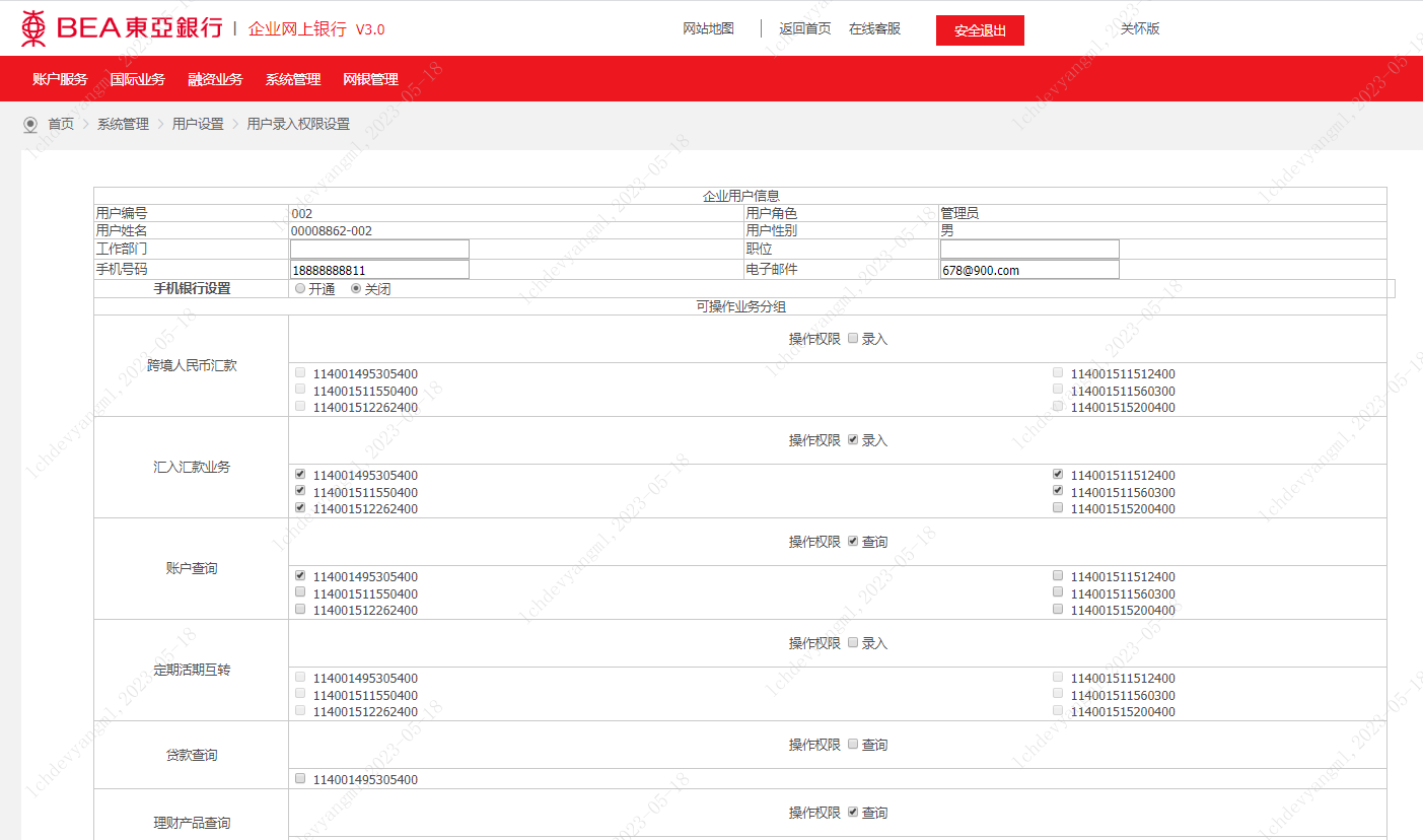 ? 授權權限無賬戶的區(qū)分,選擇“授權”的權限后,表示該用戶對此項業(yè)務的所有簽約賬戶均有某一級的授權權限;