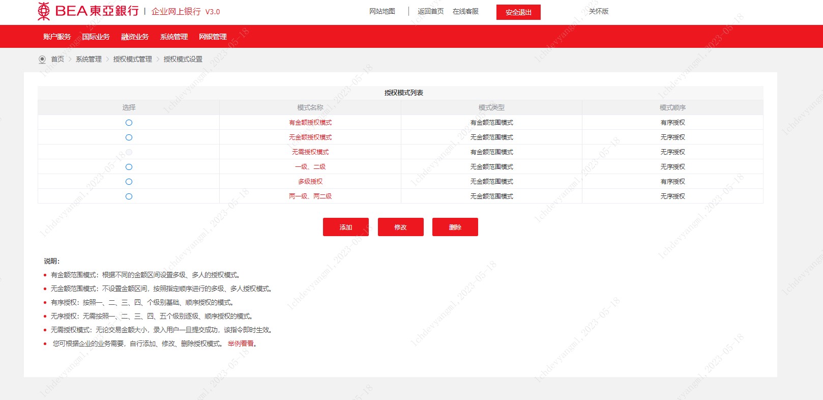 2.1.1. 授權模式是企業(yè)網銀用戶提交轉賬交易、發(fā)起交易指令需遵循的交易規(guī)則。企業(yè)可以設置每筆交易在提交到銀行前,是否需要授權、需要哪些級別的人授權、每個級別需要幾個人授權,以此來保障企業(yè)的資金安全,控制風險。企業(yè)可直接選擇系統(tǒng)已建立的“有金額授權模式”、“無金額授權模式”和“無需授權模式”,也可新建符合本企業(yè)特性的授權模式。