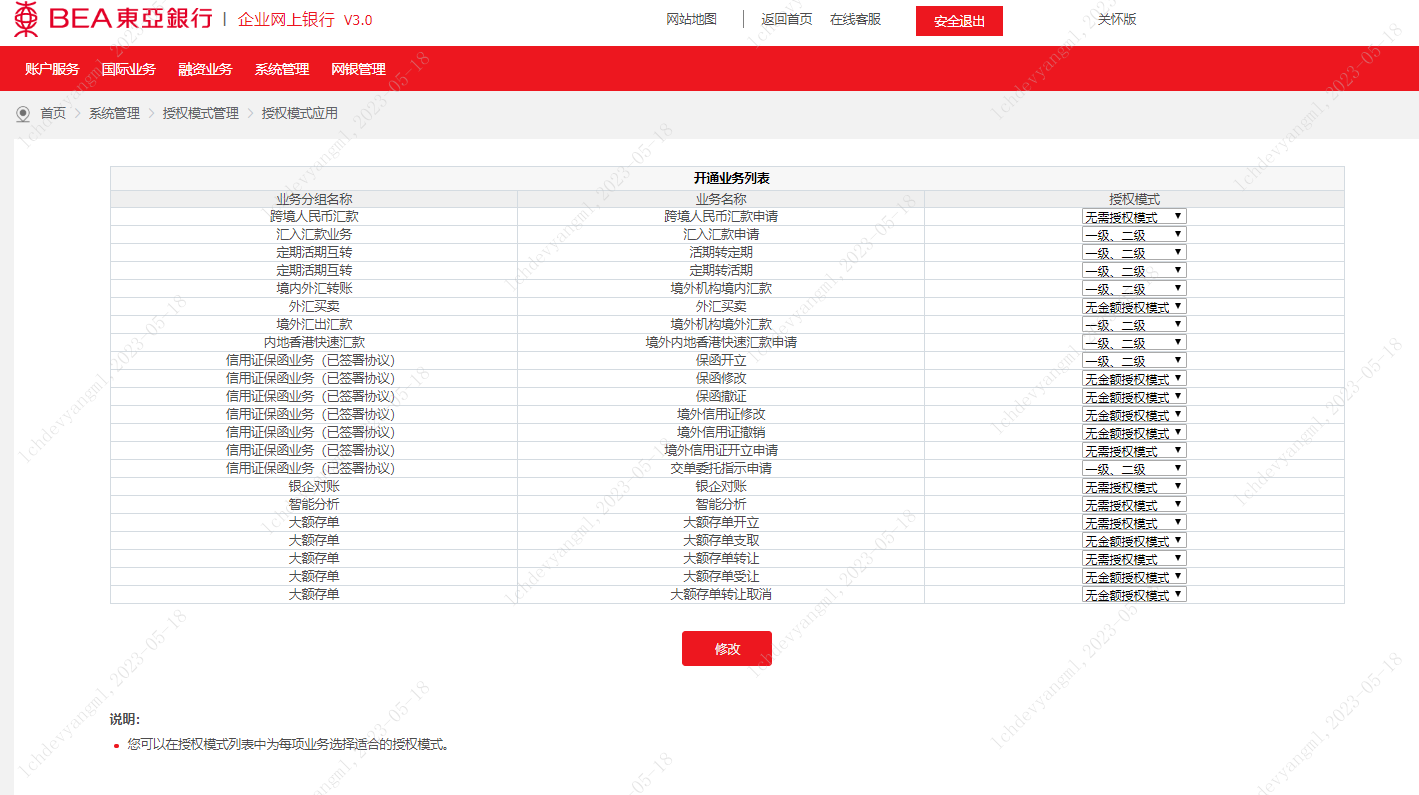 ? 開通業(yè)務列表中顯示企業(yè)在開立網銀時已開通的功能,授權模式下拉列表中顯示系統(tǒng)已建立的“有金額授權模式”、“無金額授權模式”、“無需授權模式”以及管理員新建的授權模式;