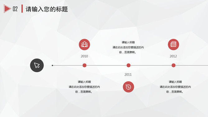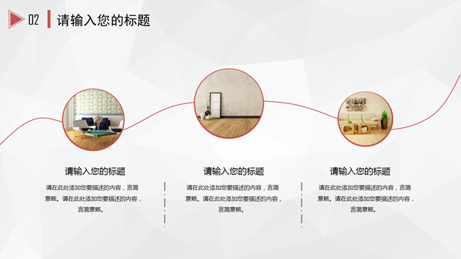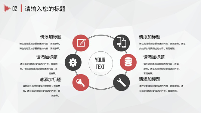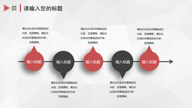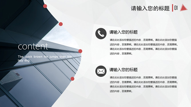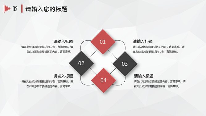 大方極簡商務通用PPT模板。一套大氣商務幻燈片模板,紅黑配色,小三角形裝飾,極簡風格,通用性強。