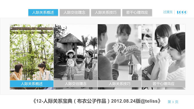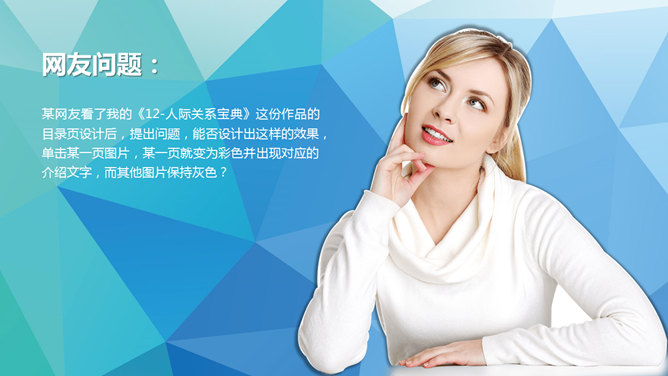 觸發(fā)器和超鏈接應(yīng)用PPT教程。觸發(fā)器與超鏈接的應(yīng)用案例。某網(wǎng)友看了我的《12-人際關(guān)系寶典》這份作品的目錄頁設(shè)計(jì)后,提出問題,能否設(shè)計(jì)出這樣的效果,單擊某一頁圖片,某一頁就變?yōu)椴噬⒊霈F(xiàn)對(duì)應(yīng)的介紹文字,而其他圖片保持灰色?遇到這個(gè)題目,首先想到是觸發(fā)器工具的運(yùn)用。單擊某個(gè)對(duì)象,出現(xiàn)某個(gè)元素,這就是利用了觸發(fā)器的原理。從上述展示來看,觸發(fā)器略顯復(fù)雜,有什么更簡單的方法呢?布衣公子靈光一閃,利用超鏈接的設(shè)置來實(shí)現(xiàn)。即把目標(biāo)效果設(shè)置成為獨(dú)立的頁面,然后通過單擊灰色圖片來訪問對(duì)應(yīng)的頁面。